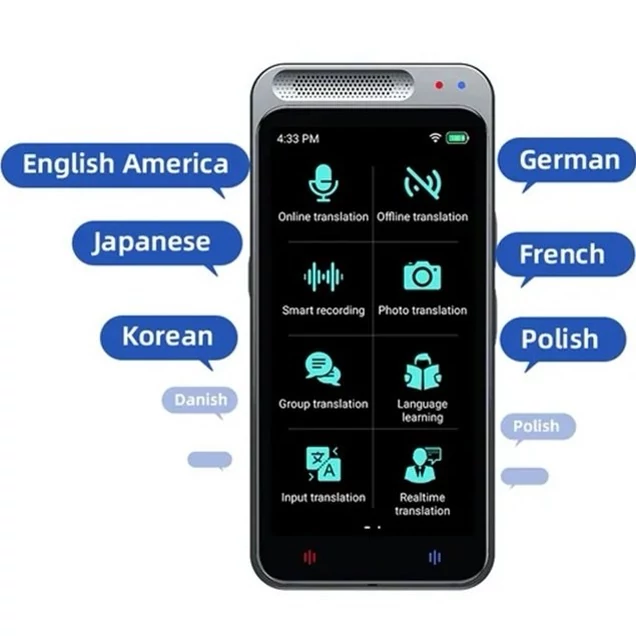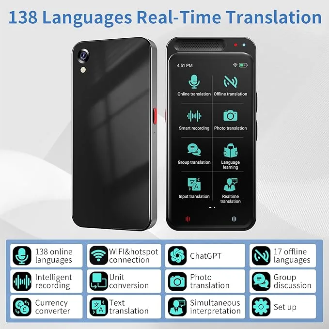 | قابلیت های ویژه | ترجمه صوتی همزمان آنلاین 138 زبان و 18 زبان به صورت آفلاین در 0.1 ثانیه, ترجمه گروهی (تا ۵۰۰ نفر), ترجمه همزمان و دوطرفه (۱۳۸ زبان), صفحه نمایش لمسی ۴.۱ اینچی HD, مجهز به دوربین 8 مگاپیکسلی |