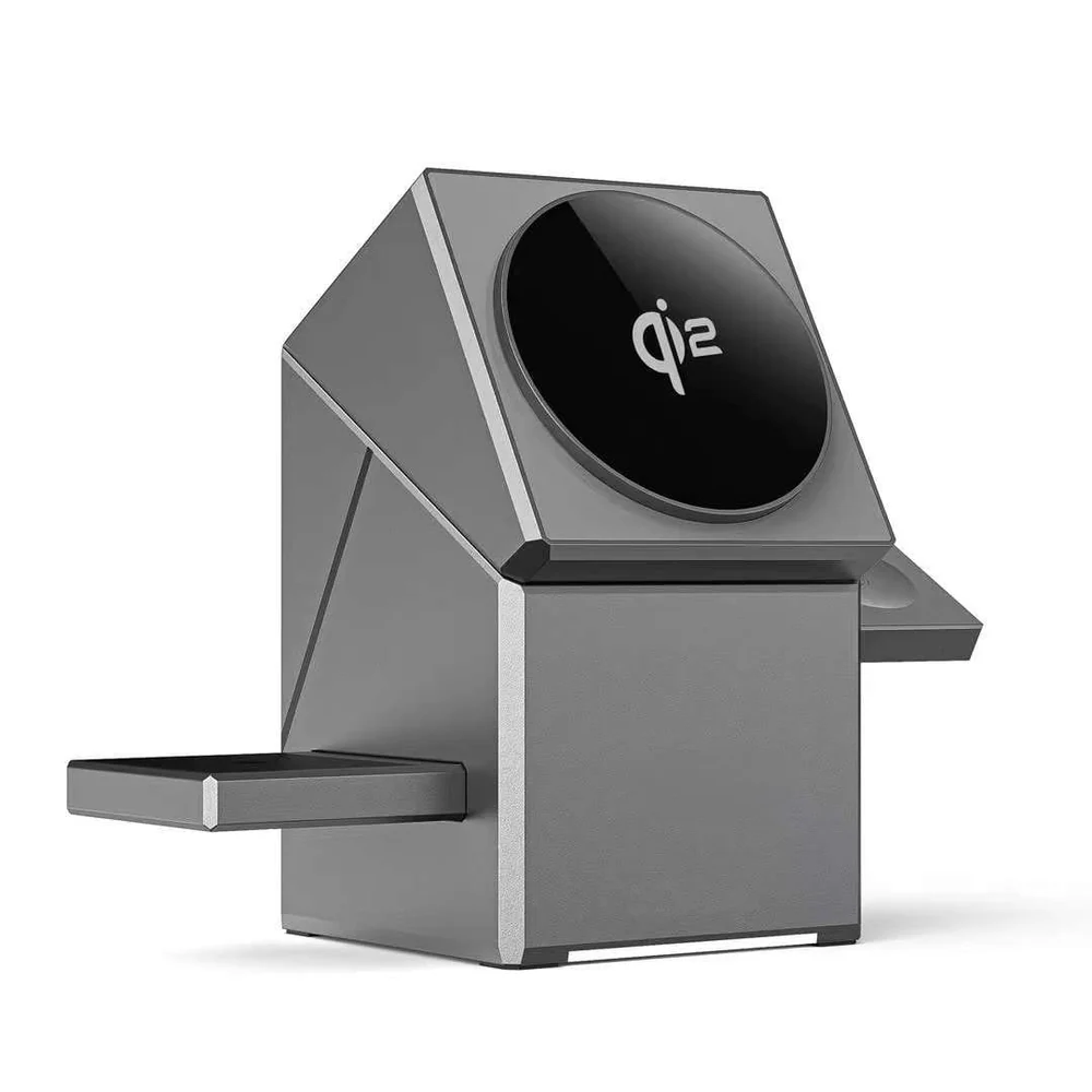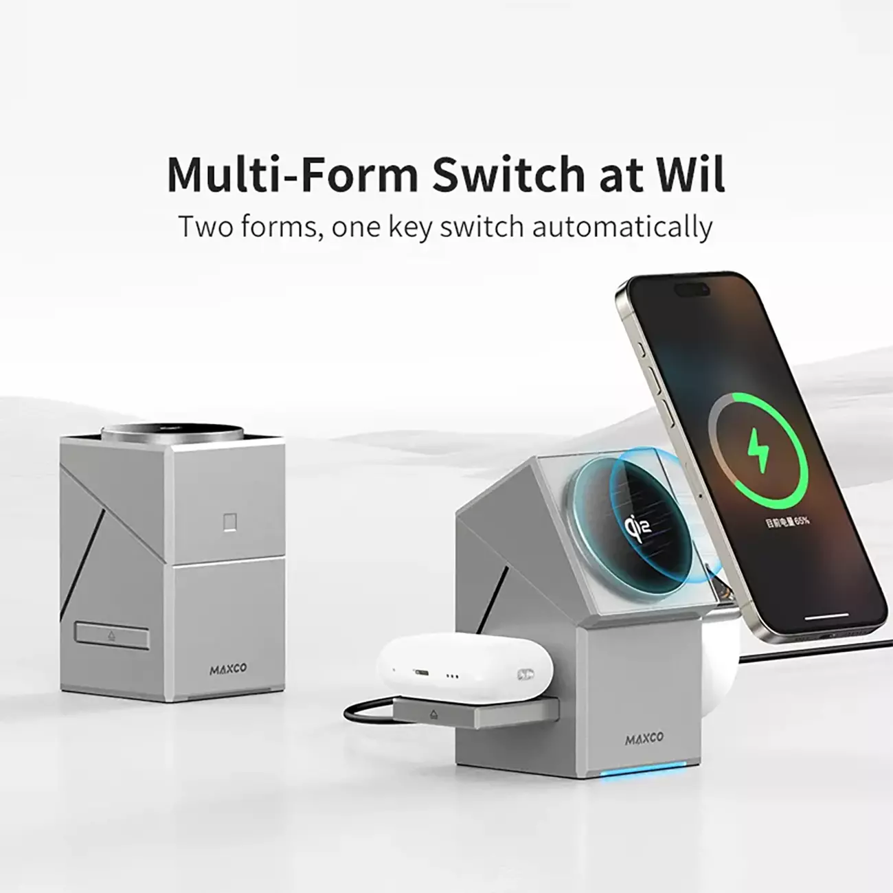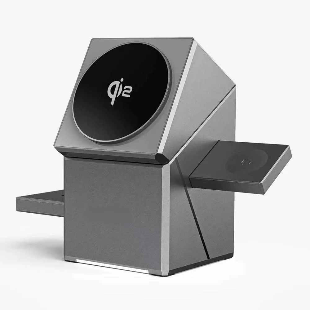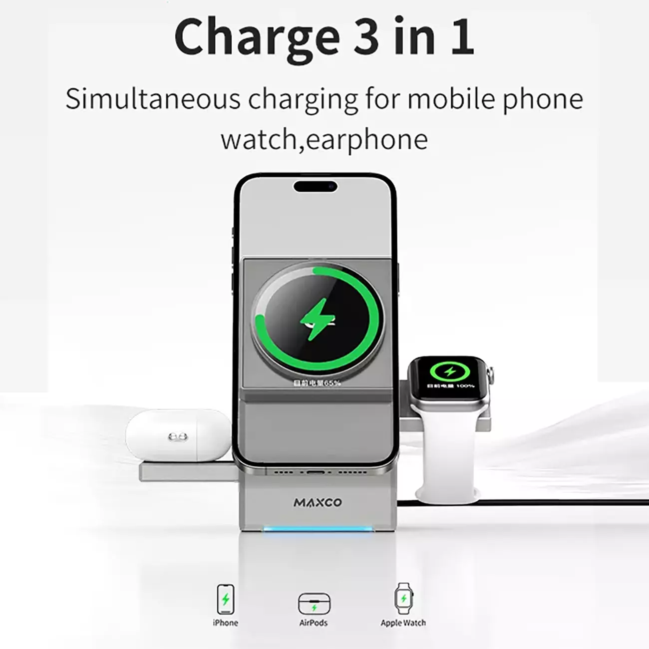 | قابلیت های ویژه | شارژ بی سیم ایرپاد با توان 2.5W, شارژ بی سیم گوشی موبایل با توان 15W, شارژ بی سیم واچ با توان 2.5W, شارژ همزمان سه دستگاه, فناوری شارژ وایرلس Qi2, قابلیت چرخش 360 درجه پایه شارژر |