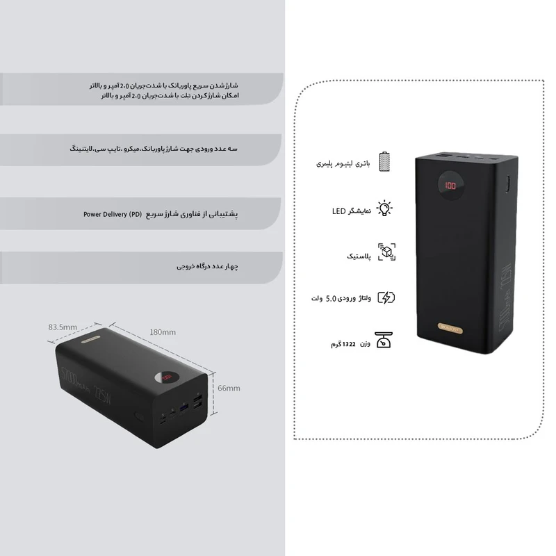با وجود ظرفیت بالا، طراحی ارگونومیک و دسته‌ی حمل این پاوربانک، جابه‌جایی آن را راحت کرده است. کیفیت ساخت بدنه و استفاده از مواد مقاوم، دوام بالای محصول را تضمین می‌کند.